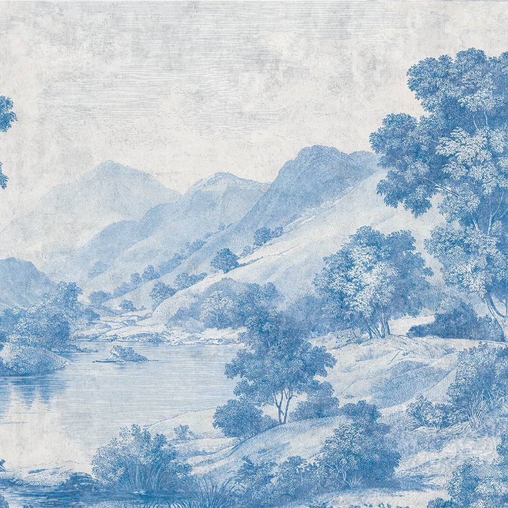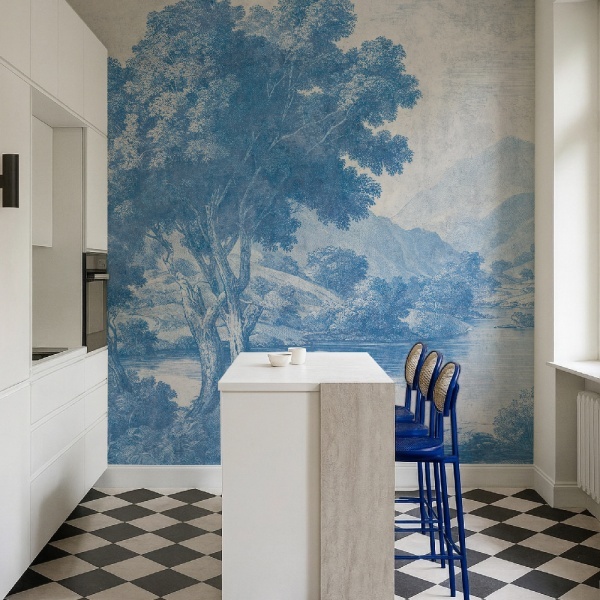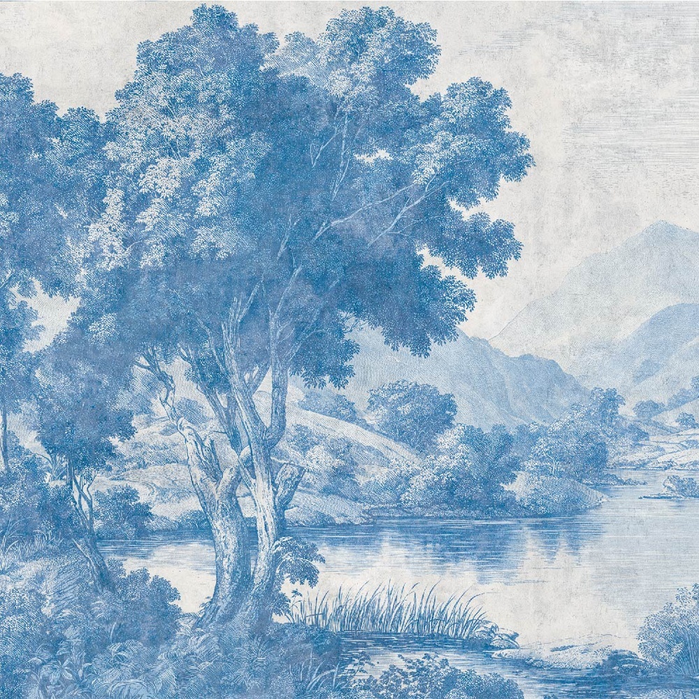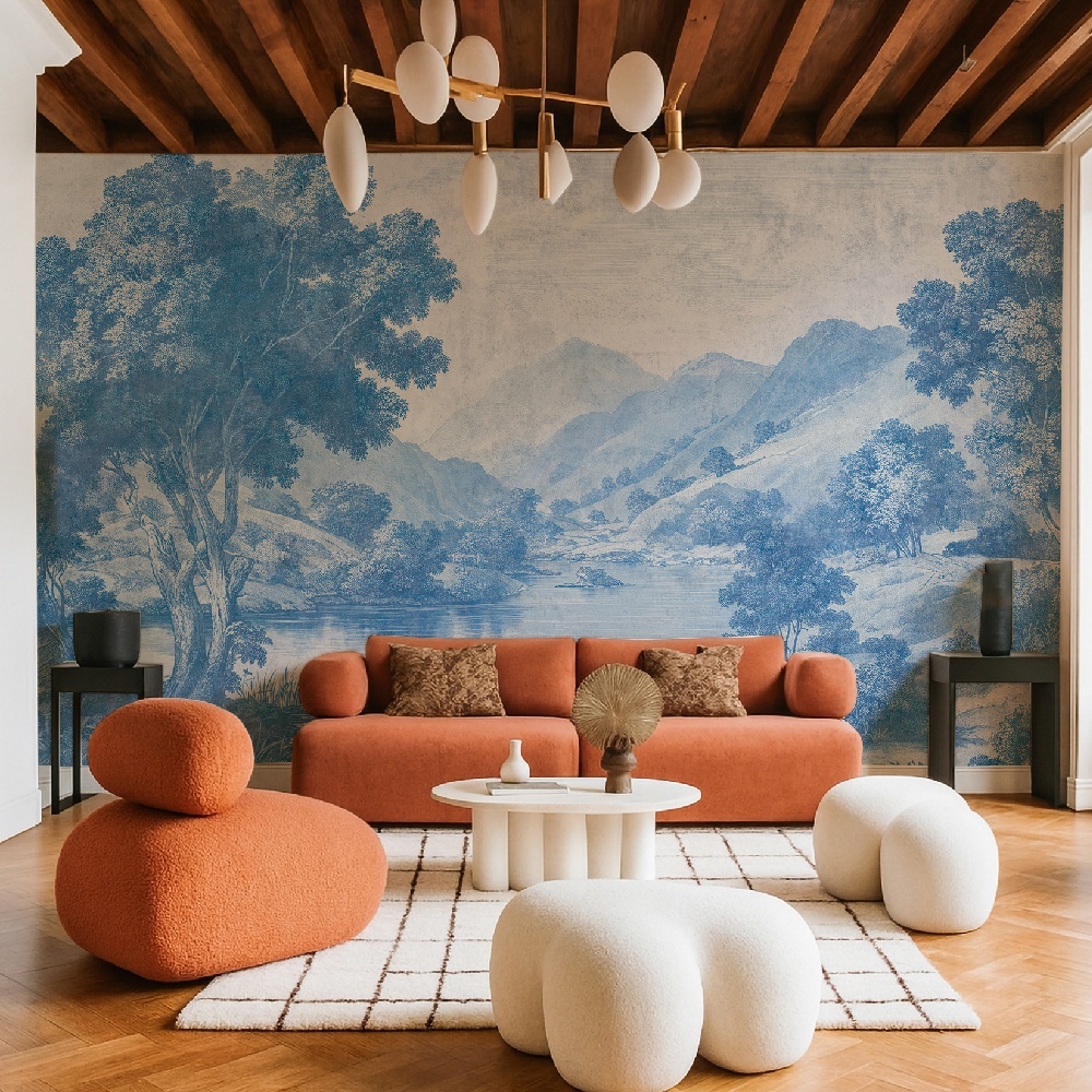 Painted in shades of misty blue, terracotta earth, and softened green, the design balances calm with decadent elegance. Each brushstroke carries the lyricism of craftsmanship. The result is a mural that feels both intimate and monumental. The atmosphere inspires reverence — as if history itself were whispering on your walls.