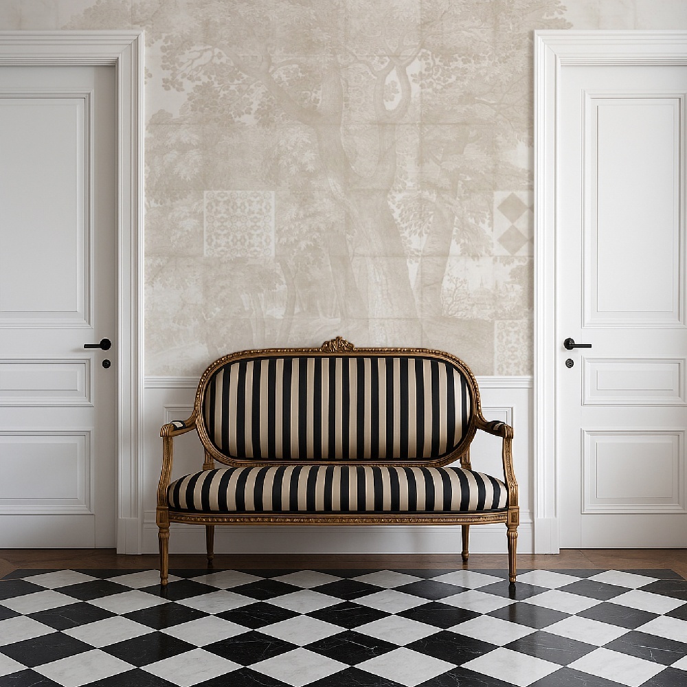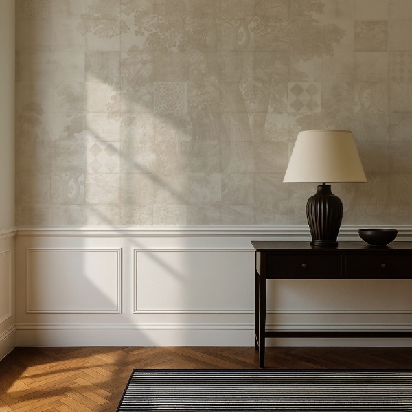 Throughout history, woodlands have symbolized refuge, wisdom, and spiritual connection. In Azure Grove Cream, these meanings take shape in a mural that turns interiors into sanctuaries of grace and grandeur.