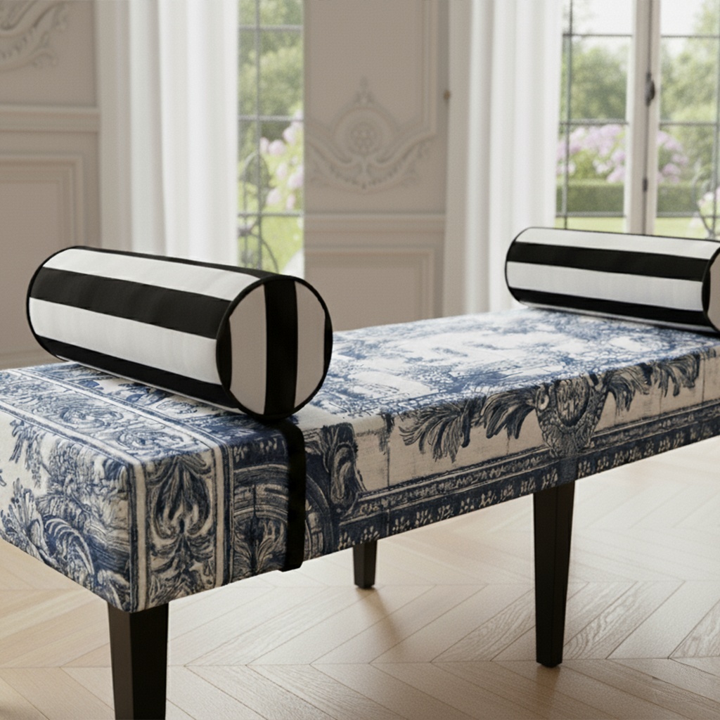 Tapiseria în nuanțe de albastru intens, cu motive ce amintesc de fresce și decorațiuni arhitecturale, transformă suprafața băncii într-o compoziție vizuală sofisticată. Acest print artistic, specific lumii VLAdiLA, creează o atmosferă de poveste, aducând un aer de noblețe și calm interiorului. Cele două role laterale, îmbrăcate în dungi alb-negru, introduc un contrast contemporan puternic, oferind piesei o notă grafică distinctă și o estetică statement.