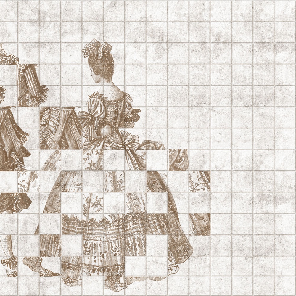 Decadent Fragments Cream is a mural of broken beauty — aristocratic figures melting into the glittering mosaics of memory. This wallpaper celebrates imperfection as art. The fragmented shapes hold the same grandeur as full portraits.