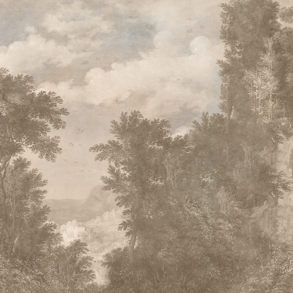 Hand-painted in patinated tones of terracotta, moss, and faded blue, Eternal Ruins Cream captures the textures of stone and vegetation. It blends nature and architecture in a decadent embrace.