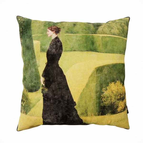 Garden Stroll is a pictorially designed decorative cushion inspired by the classic elegance of the Victorian era. The printed image depicts a solitary female figure, wearing a vintage tailored black dress, strolling through an aristocratic garden maze, outlined in vibrant shades of green. This composition evokes the inner tranquillity, introspection and quiet refinement of a woman symbolically traversing the ordered space of controlled nature. The ideal cushion for classically influenced, dark academia, cottage or romantic settings, Garden Stroll brings a narrative, elegant and atmospheric accent. The colour palette, dominated by shades of moss green and sunshine yellow, is balanced by the deep black silhouette, providing visual contrast and decorative impact. Crafted from quality, high-fidelity printed materials, the cushion is suitable for sofas, reading nooks, bedrooms or commercial spaces that want to convey a story. It's more than a textile object - it's a miniature scene that transforms space through art, symbol and understated elegance. A visual homage to contemplative femininity.