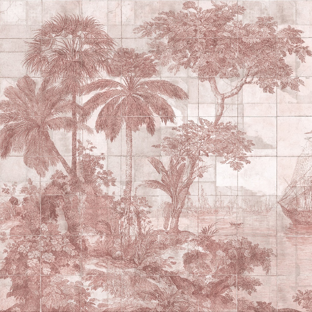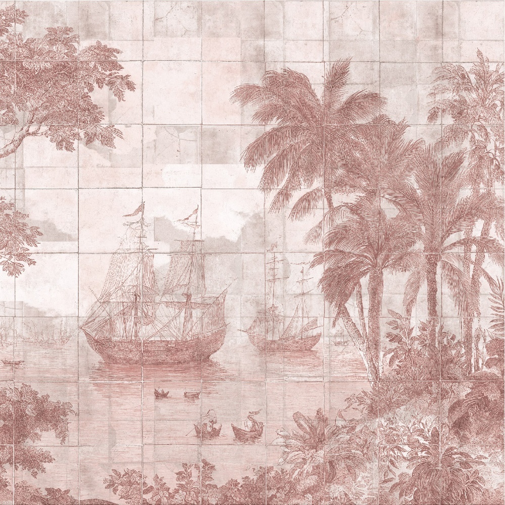 Golden Harbor Rose is a mural of marine grandeur. It evokes sunlit harbors and palatial shores. It is painted in warm terracotta tones with shimmering golden accents. The wallpaper captures the romance of travel, exploration, and ageless horizons.