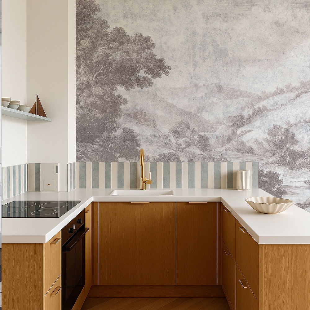 Hills Serenade Rose captures the gentle rhythm of rolling landscapes, painted in soft, melodic strokes. This wallpaper turns the poetry of nature into a symphony of shapes and shades. It creates a calm atmosphere wrapped in aristocratic elegance.