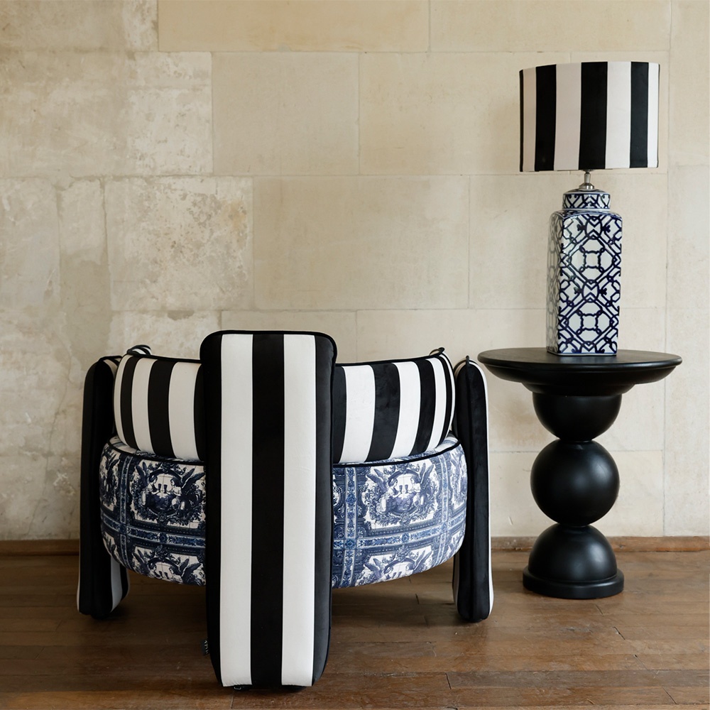 The round, sculptural shape and the rich upholstery turn this armchair into a textile art piece. The back, dressed in black-and-white stripes, adds a strong graphic contrast. It balances the delicacy of the central motif with a modern, dynamic note. This is a statement piece designed to command the room and become the focal point of any decor.