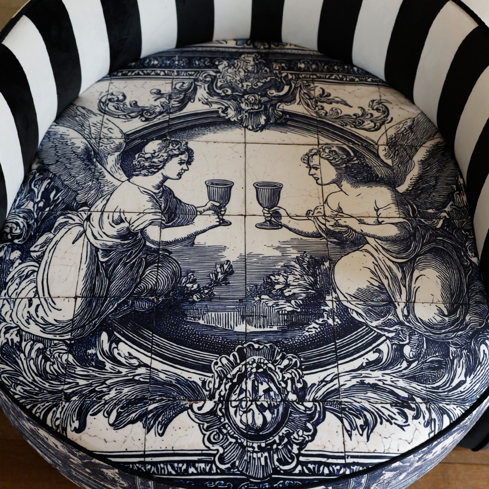 The Picasso Cherubin armchair is an exclusive furniture piece signed by VLAdiLA, merging classical decorative art with contemporary design in a striking composition. Inspired by Portuguese azulejos and Baroque aesthetics, its artwork depicts two angelic silhouettes in a scene of symbolic communion, with refined touches in white and cobalt blue.