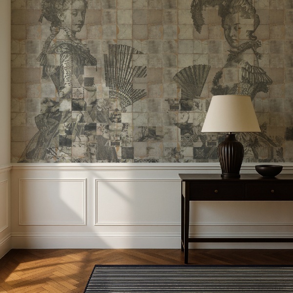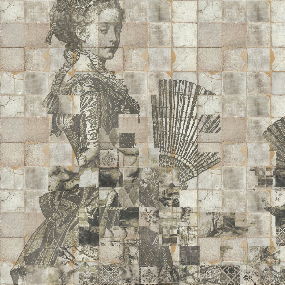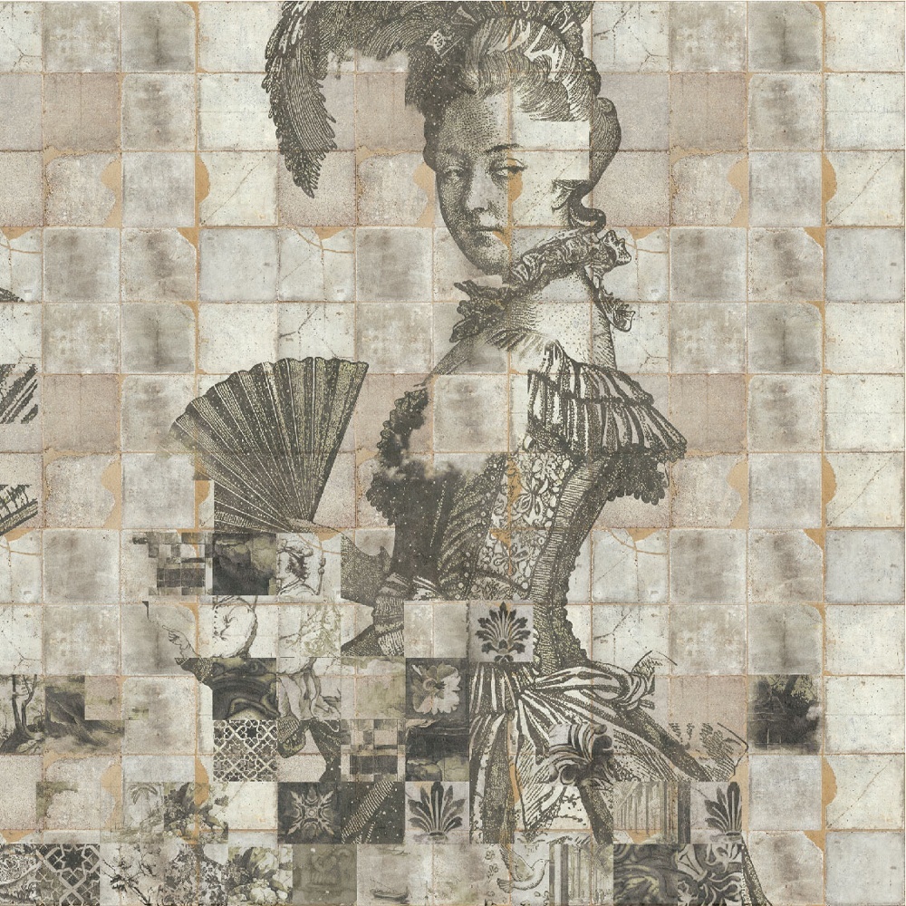 Shattered Dames Cream is a mural of fragmented elegance. Aristocratic portraits dissolve into mosaics of memory.