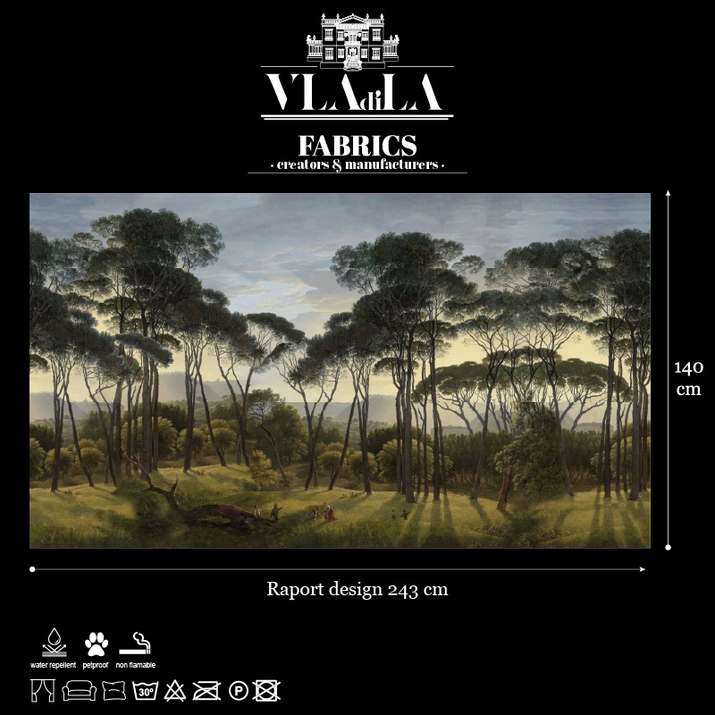 Thus, we firmly believe that every space needs visual texture. In our case, this translates to the heavy folds of velvet. The Umbrella Pines fabric pattern captures just that. Its rich surface has something of time-worn refinement. The dignity of noble elegance: the luxury you feel, without having to communicate it.